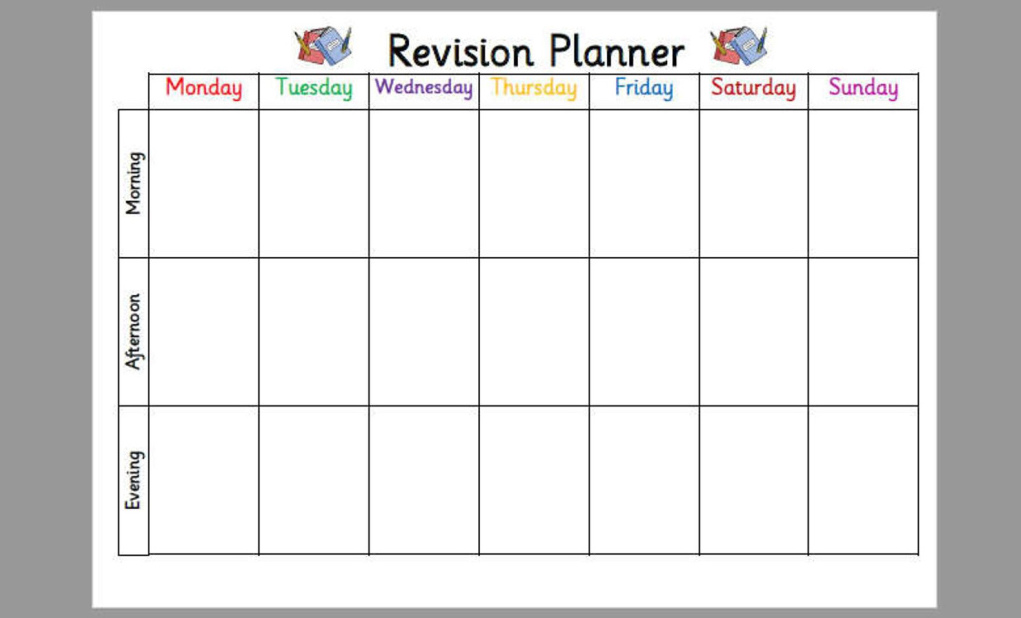 - Start with a blank template for each week: morning, early afternoon, late afternoon and evening sessions each day, perhaps. You can use a week per page calendar or diary, or create a Word table with five columns (the first split into days of the week) and eight rows (the first with the headings morning, early afternoon, late afternoon & evening). Or do two or more weeks to a page, if you are neat or are typing. (N.b. Pre-structured online commercial revision guides are very complicated and encourage students to be over ambitious in what they include, and they might therefore not be as effective: you might not be as likely to stick to them.)